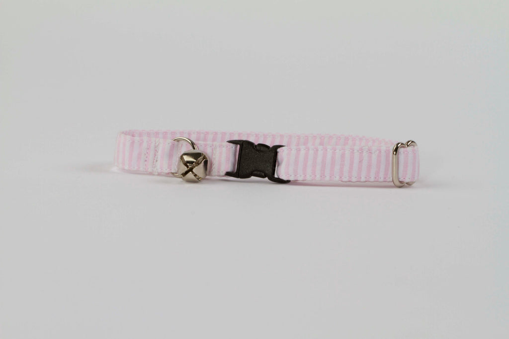 Who says The Southern Pup only cares about dogs, we love kitties too!! This stylish collar is perfect for the preppy kitty to jingle around the home in. This collar is made from a cheery pink seersucker with a black breakaway buckle and fun jingle bell.